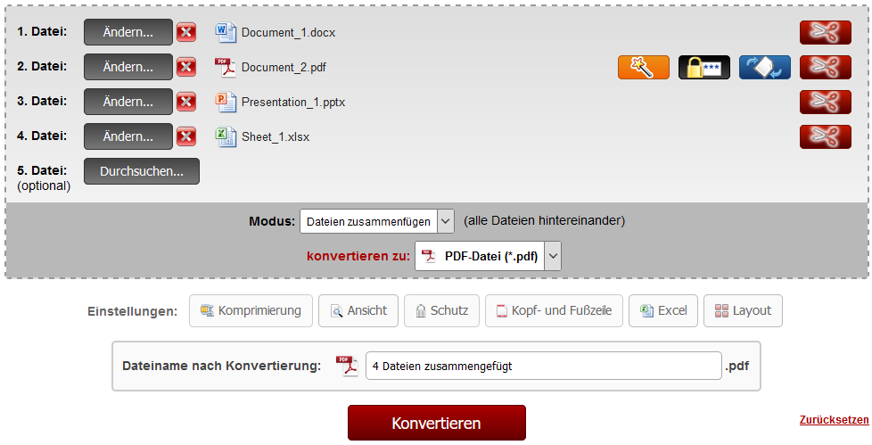 Hierfür wählen Sie alle Dateien aus, die Sie zu einer PDF-Datei zusammenfügen möchten, und klicken anschließend auf 'Konvertieren'. Alle Dateien werden in der selben Reihenfolge zusammengefügt, wie sie angegeben wurden.