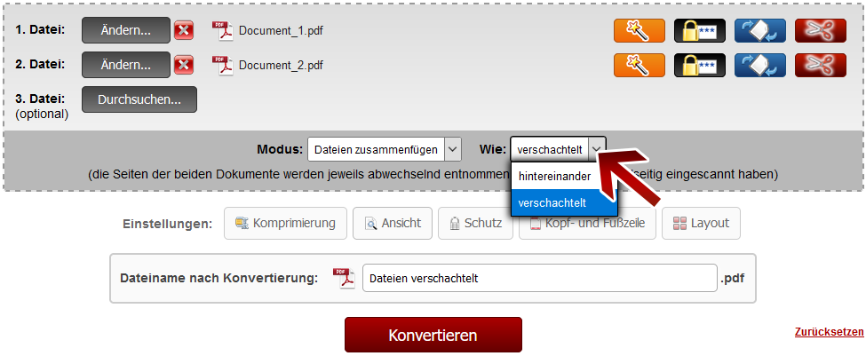 Wenn Sie diese Einstellung nutzen möchten, wählen Sie 2 gescannte Dokumente aus (PDF, XPS, TIFF). Bei der Konvertierung werden die Seiten der beiden Dokumente jeweils abwechselnd entnommen. Dies ist sinnvoll, wenn Sie Seiten doppelseitig eingescannt haben bzw. ein Dokument nur die Vorderseiten beinhaltet und das zweite Dokument jeweils die Rückseiten.
