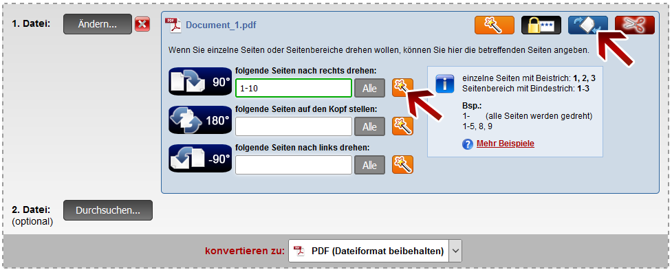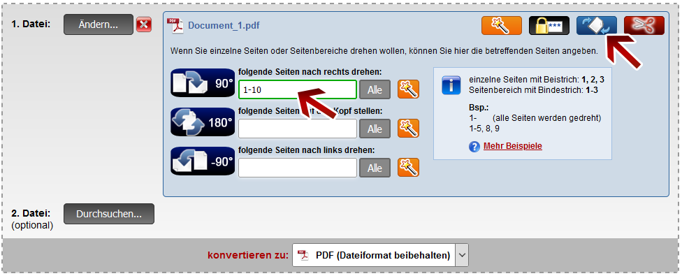 Nun können Sie jene Seiten angeben, die Sie drehen möchten. Dabei ist es möglich die Seiten nach rechts zu drehen (90°), auf den Kopf zu stellen (180°) oder nach links zu drehen (-90°). Schreiben Sie dazu die Seitenzahlen in das entsprechende Feld.