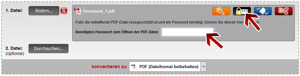 Falls die hochgeladene PDF-Datei einen Berechtigungsschutz aufweist (Drucken, Kopieren, Ändern einzeln oder in Kombination gesperrt) wird dieser automatisch während der Konvertierung aufgehoben und die PDF-Datei somit entsperrt. Hierfür ist kein Passwort notwendig. Diese Funktion fungiert als schnelles 'PDF Unlock Tool'.