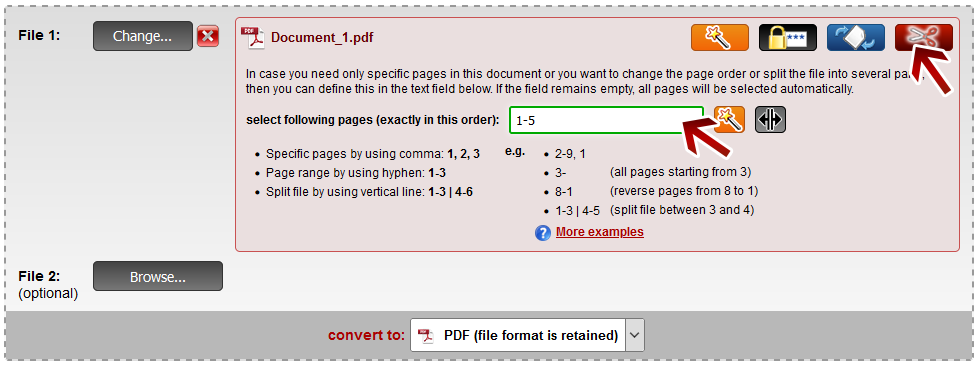 You can split your PDF file into several parts. Enter your required file parts into the textfield for the page composition. Separate each part with a vertical line. For example: 1-3 | 4-5 results in a ZIP archive containing two PDF files. The first contains the pages 1-3 and the second contains the pages 4-5.