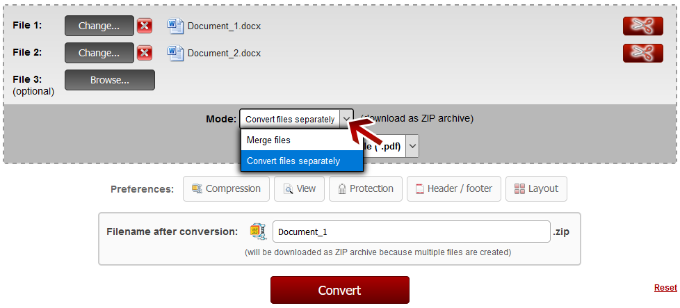 Convert several files separately at the same time:To convert multiple files individually and at the same time, you have to choose the option 'Convert files separately' after you have selected the files. As a result you get a ZIP archive, which contains all the converted PDF files. If you do not choose this option, the files are still converted, but the files are merged and you get only one single PDF file as output.   | Note: Add multiple files at the same time |