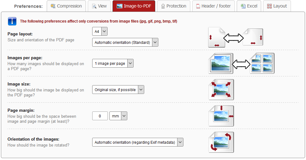 In case you are converting image files (like jpg, gif, png, bmp, tif) you can define the page layout, the number of images per page, the minimum page margin and the size and orientation of the image. Just click on "Image-to-PDF" in the preferences.