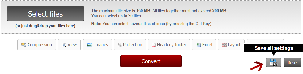 The settings of the converter can be saved in the browser storage, and they are still available after closing the browser window. Files that were already selected, selected pages and passwords cannot be saved.