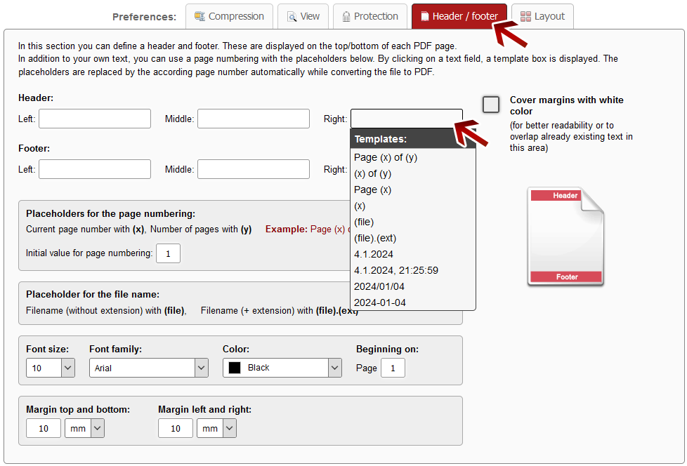 You can define a header and footer for your resulting PDF file. These are displayed on the top/bottom of each PDF page. In addition to your own text, you can use a page numbering with placeholders for the page number. By clicking on a text field, a template box is displayed. The placeholders are replaced by the according page number when converting the file to PDF.