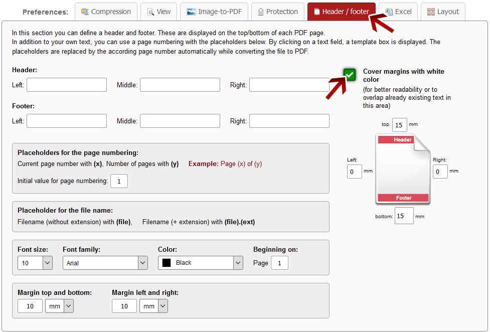 Click on the preference tab "Header / footer". Afterwards, further options concerning header / footer will be displayed.
