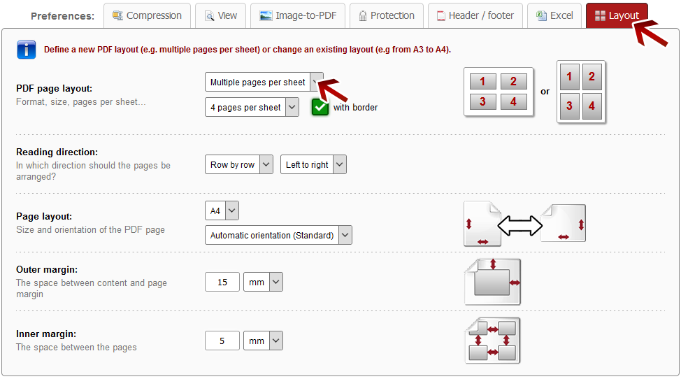 Click on the preference tab "Layout". There, choose for the "PDF page layout" the option "Multiple pages per sheet" in the dropdown menu. Afterwards, further layout options will be displayed.