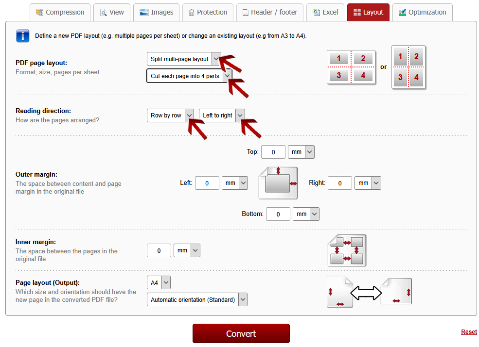 You can convert a PDF with multiple pages per sheet into 1 page per sheet. Each page will be cut into multiple parts. Choose the appropriate option in the dropdown menu. Afterwards you can define some adjustments to improve the accuracy for the cutting: the outer margin and also the inner spacing between the pages on a sheet in the original file.