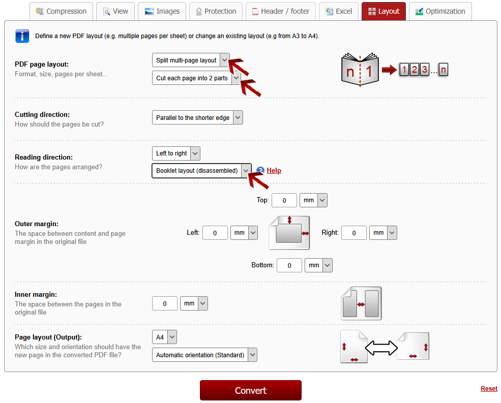 Click on the preference tab "Layout". There, choose for the "PDF page layout" the option "Split multi-page layout" in the dropdown menu. Afterwards, further layout options will be displayed.