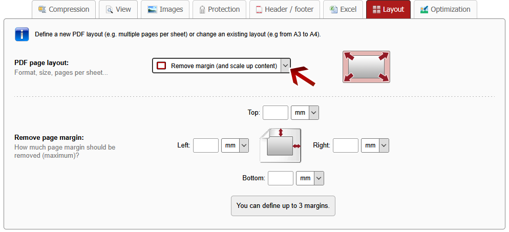 Choose the option "Remove margin" if you want to remove the page margin. The content will be scaled up, but the page size will remain the same.